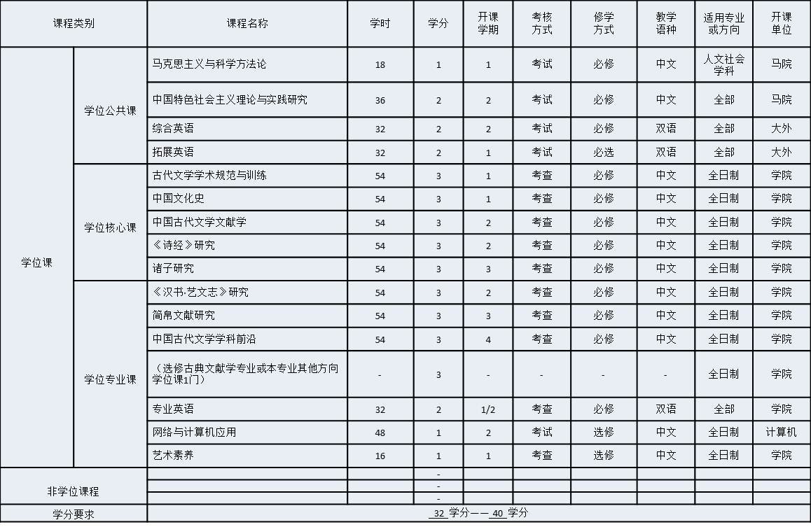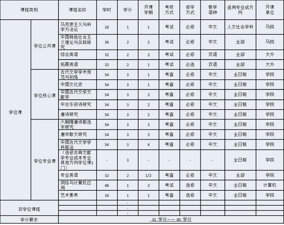 中国古代文学一级学科学术学位硕士研究生课程设置及学分要求